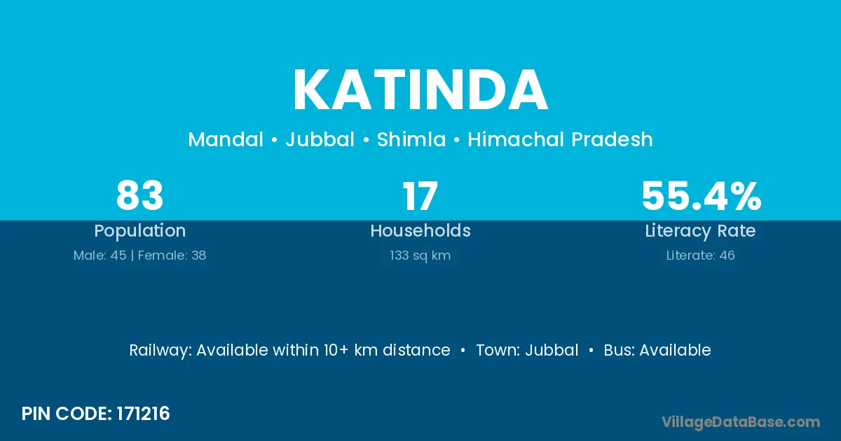 Katinda village has a total population of 83 people, of which 45 are males and 38 are females.