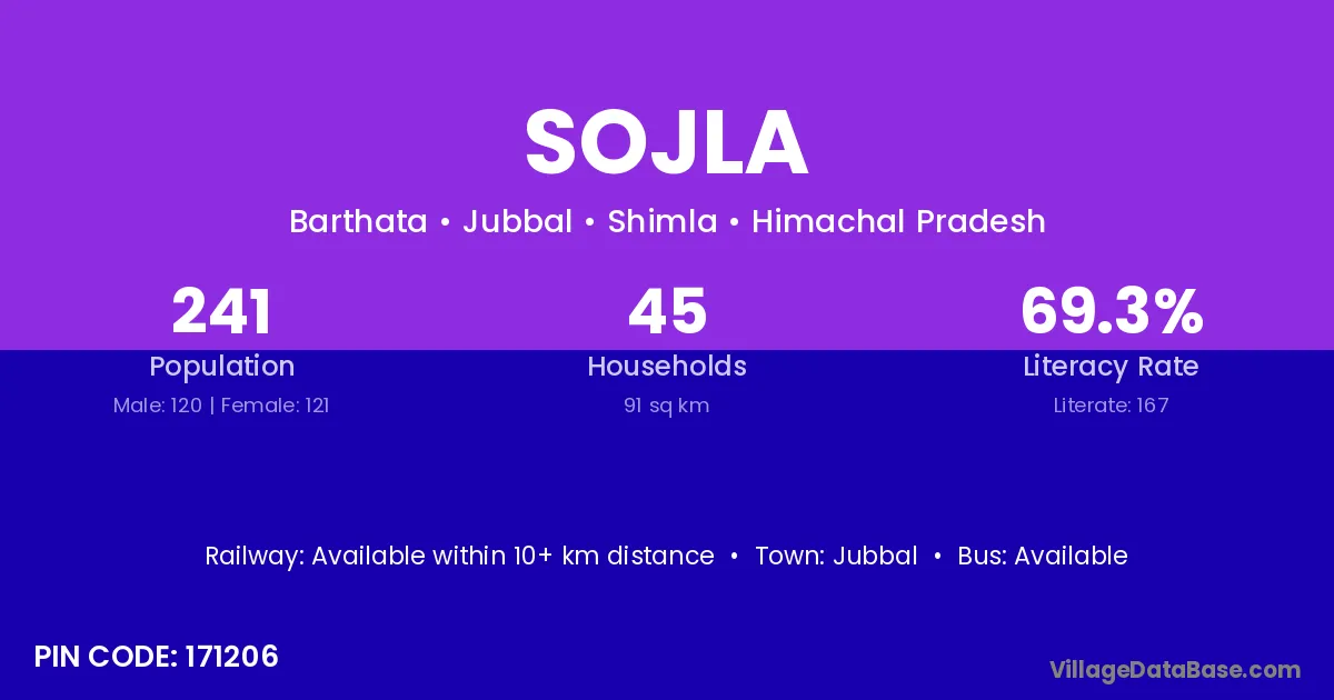 Sojla village has a total population of 241 people, of which 120 are males and 121 are females.