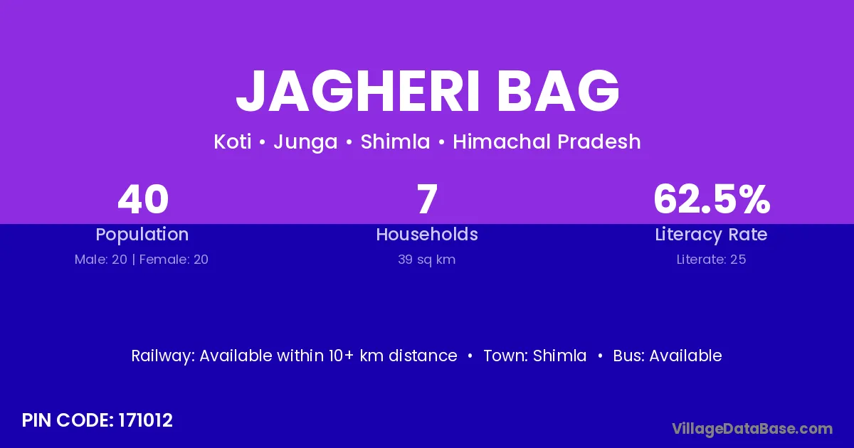 Jagheri Bag village has a total population of 40 people, of which 20 are males and 20 are females.