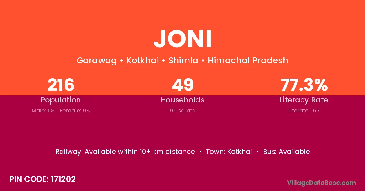 According to Census 2011 information, the village code of Joni village is 171202.