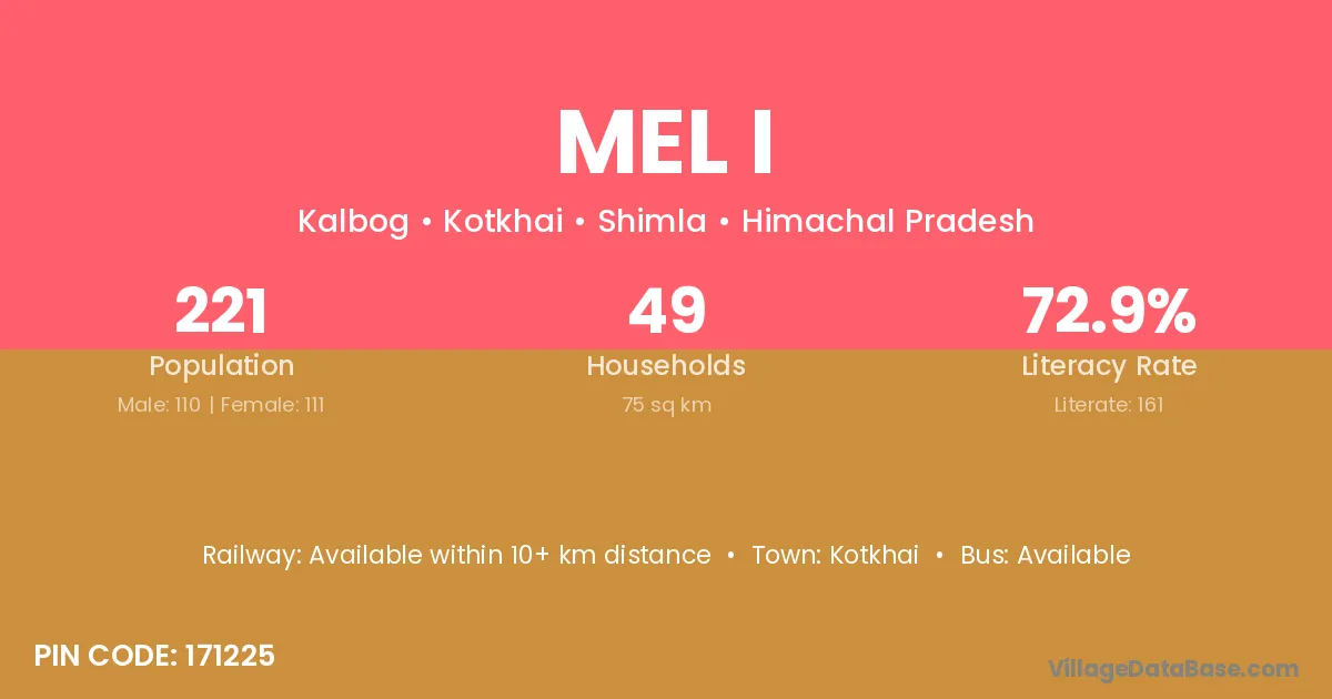 Mel I village is located in the Kotkhai Tehsil of the Shimla district in Himachal Pradesh .