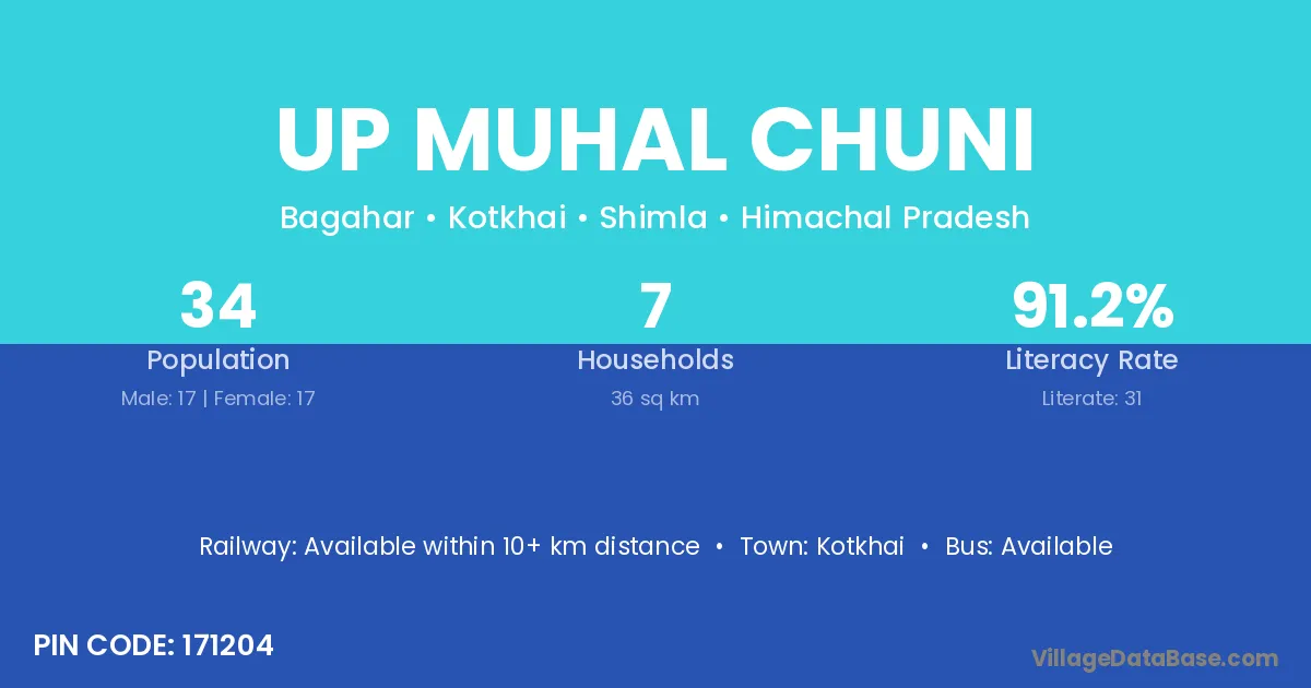 Up Muhal Chuni village has a total population of 34 people, of which 17 are males and 17 are females.