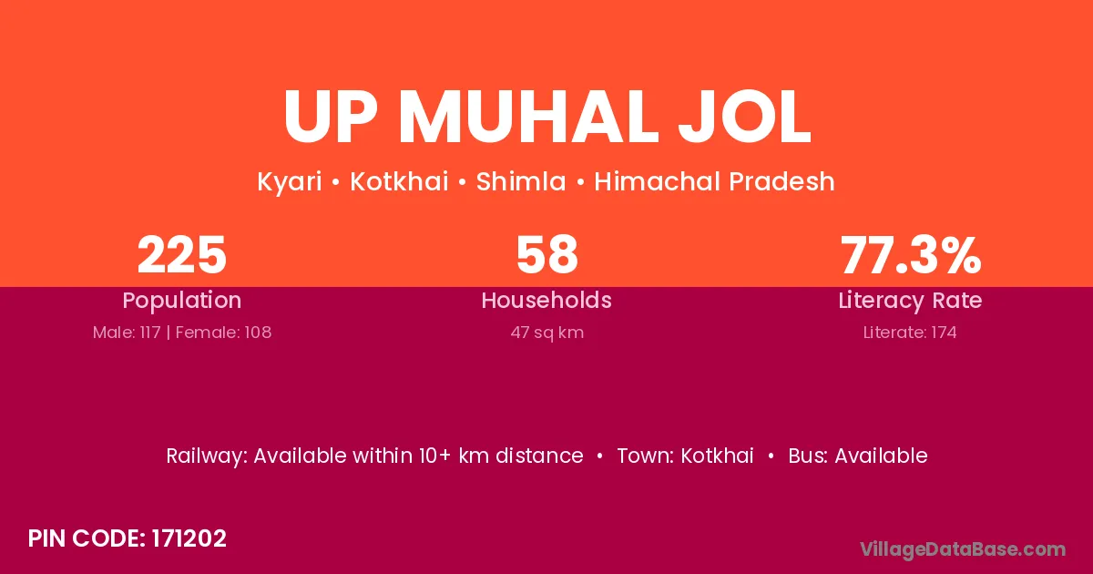 Up Muhal Jol village has a total population of 225 people, of which 117 are males and 108 are females.