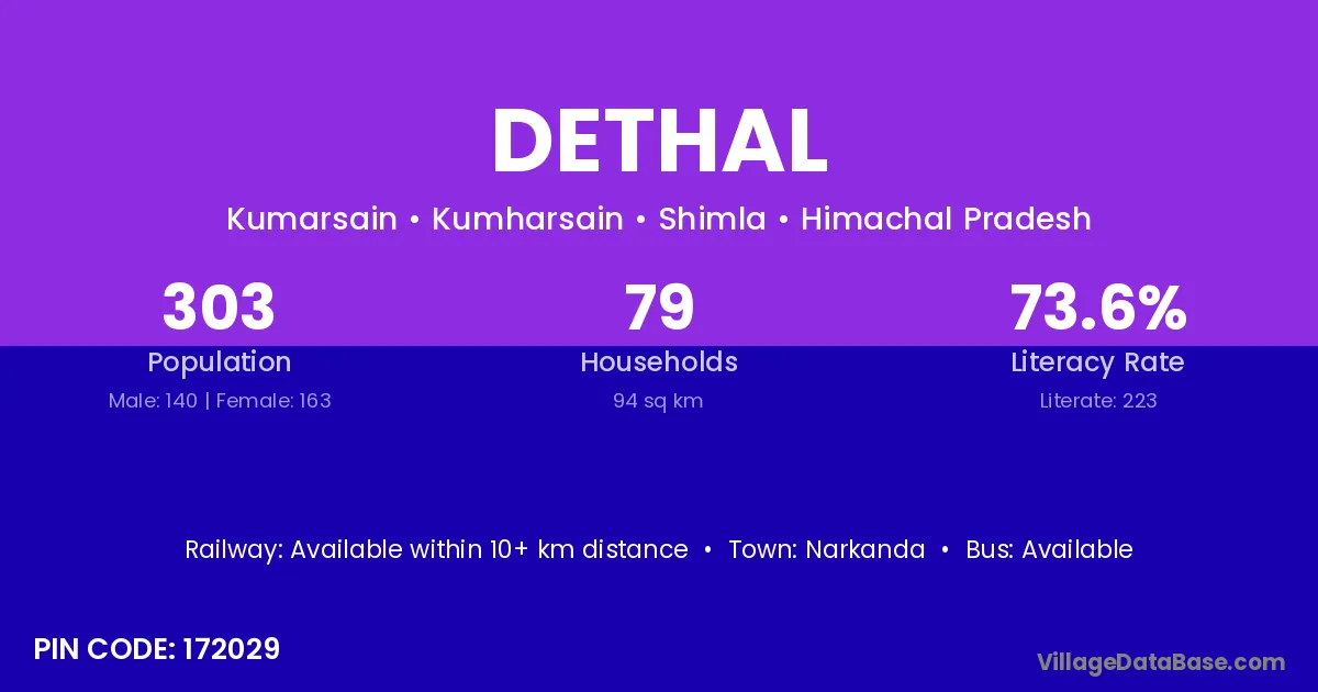 Dethal village has a total population of 303 people, of which 140 are males and 163 are females.