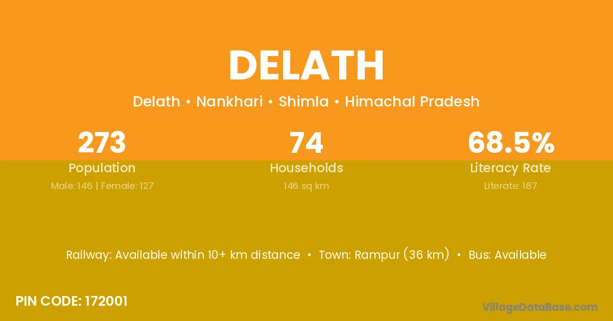 Rampur (36 km) is the nearest town to Delath village for major economic activities and is located approximately 36 km away.