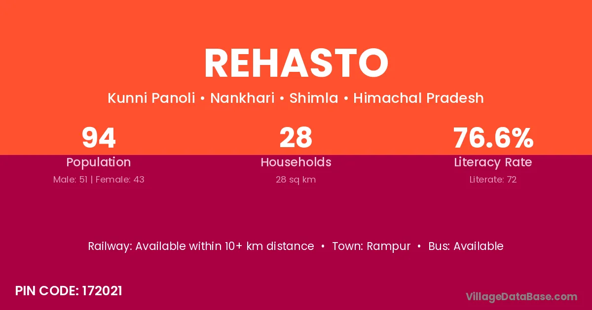 Rehasto village has a total population of 94 people, of which 51 are males and 43 are females.