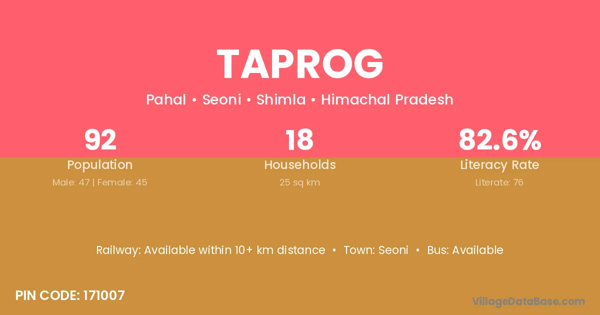 The literacy rate of Taprog village is 78.71%. Male literacy stands at 80.62% and female literacy at 76.79%.