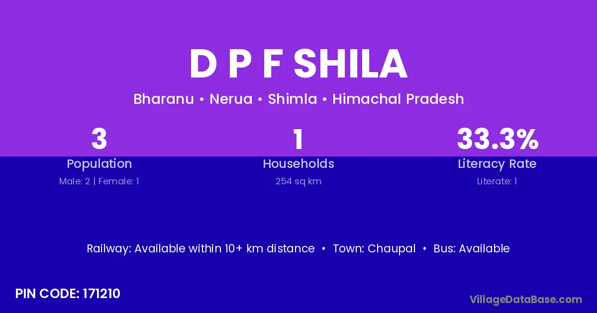 The literacy rate of D P F Shila village is 33.33%. Male literacy stands at 50.00% and female literacy at 0.00%.