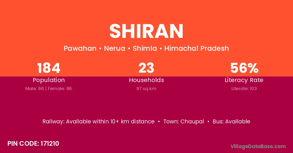 Shiran village has a total population of 184 people, of which 98 are males and 86 are females.