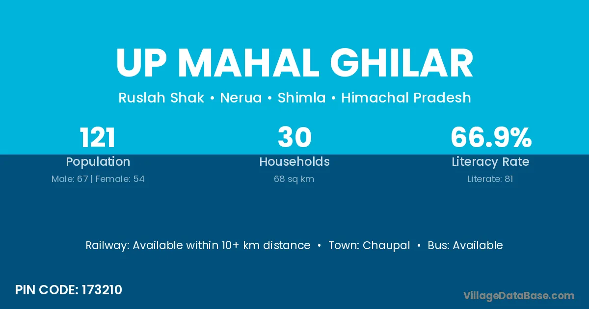 Up Mahal Ghilar village has a total population of 121 people, of which 67 are males and 54 are females.