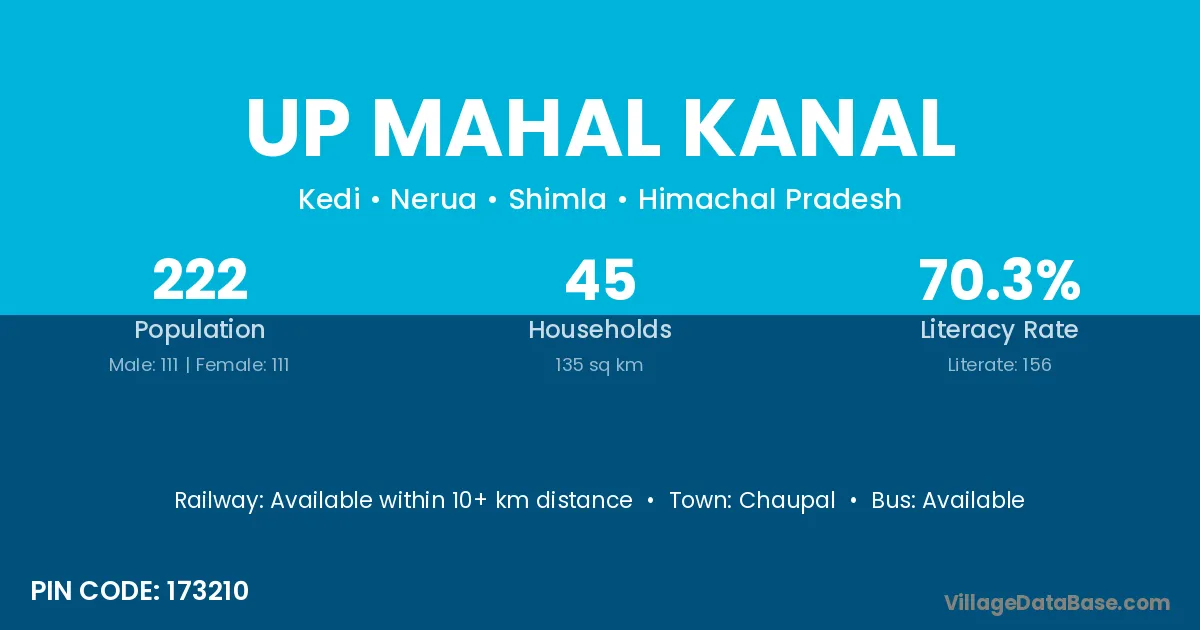 Up Mahal Kanal village has a total population of 222 people, of which 111 are males and 111 are females.