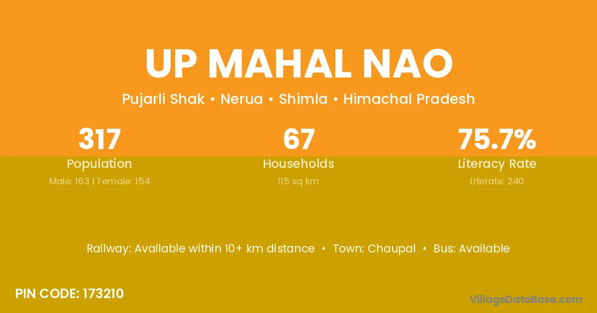 Up Mahal Nao village has a total population of 317 people, of which 163 are males and 154 are females.
