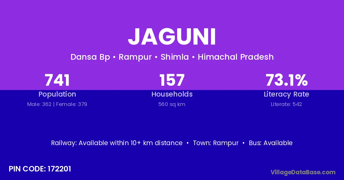 Jaguni village has a total population of 741 people, of which 362 are males and 379 are females.
