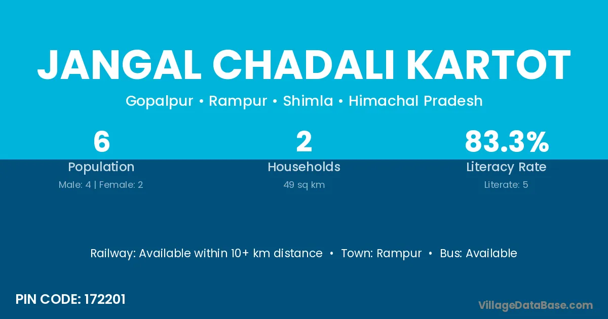 Jangal Chadali Kartot village has a total population of 6 people, of which 4 are males and 2 are females.