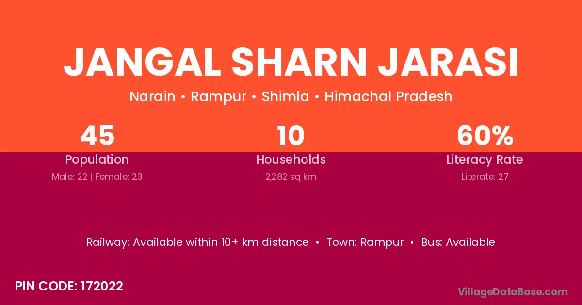 Jangal Sharn Jarasi village has a total population of 45 people, of which 22 are males and 23 are females.