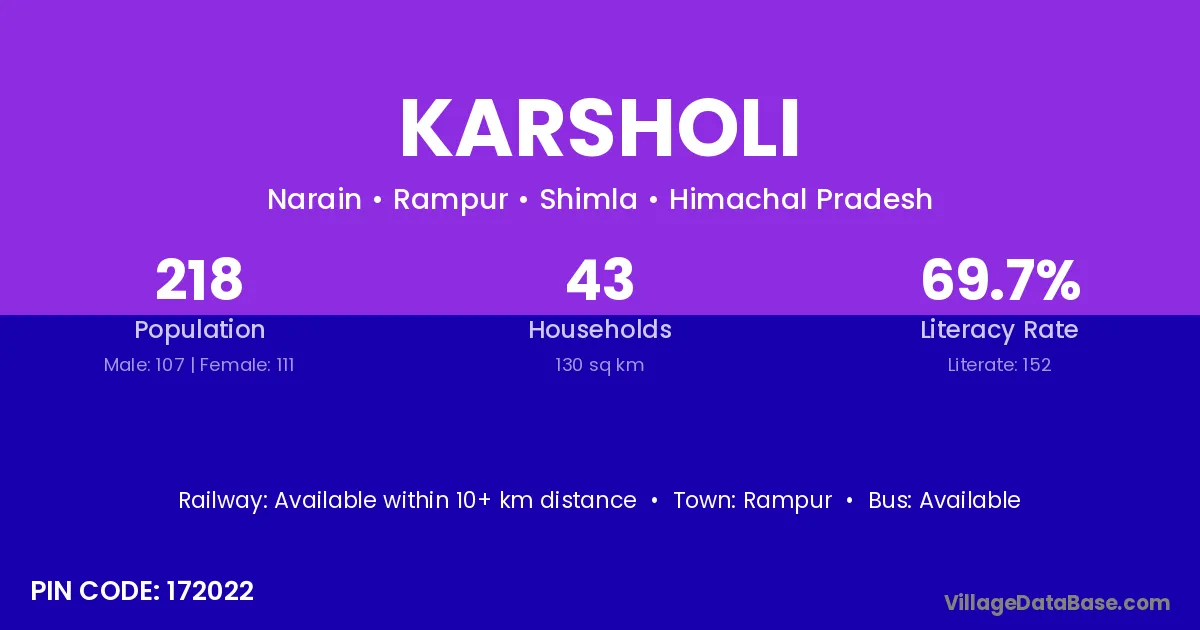 Karsholi village has a total population of 218 people, of which 107 are males and 111 are females.
