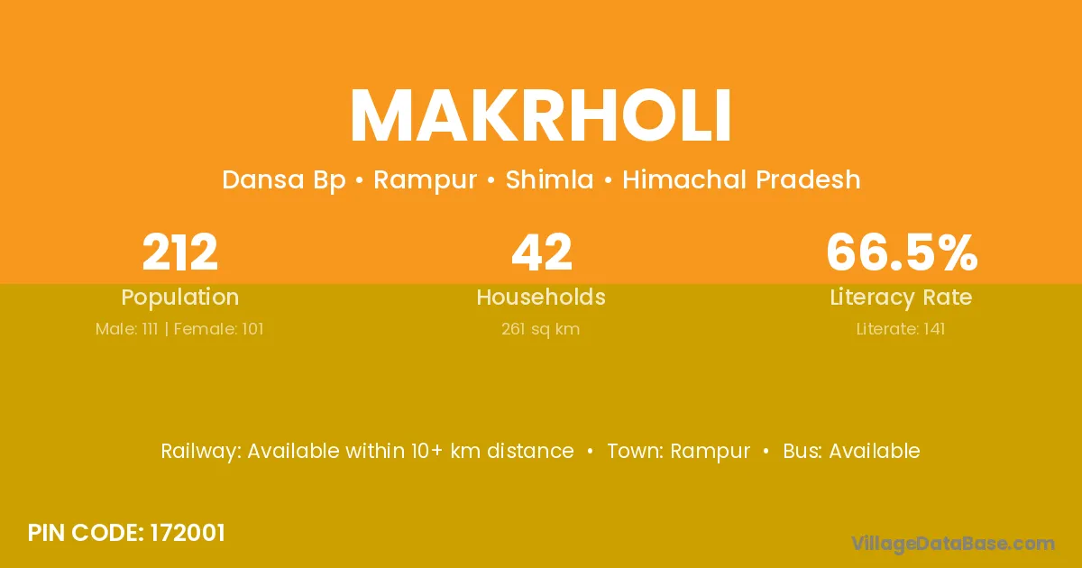 Makrholi village has a total population of 212 people, of which 111 are males and 101 are females.