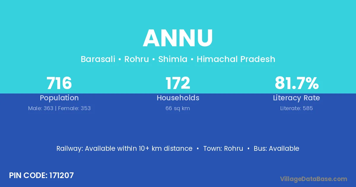 Annu village has a total population of 716 people, of which 363 are males and 353 are females.