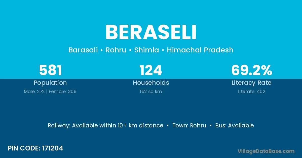 Beraseli village has a total population of 581 people, of which 272 are males and 309 are females.