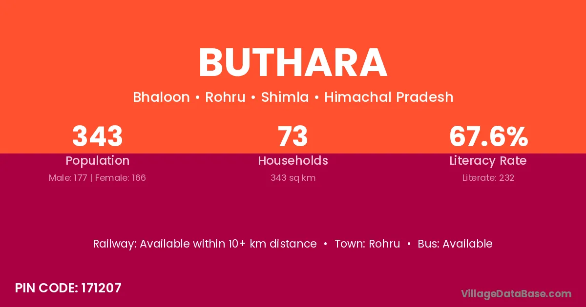 Buthara village has a total population of 343 people, of which 177 are males and 166 are females.