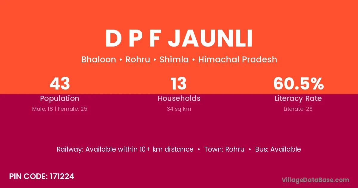 D P F Jaunli village has a total population of 43 people, of which 18 are males and 25 are females.