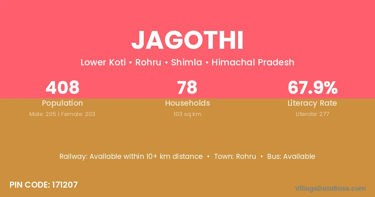 Jagothi village has a total population of 408 people, of which 205 are males and 203 are females.