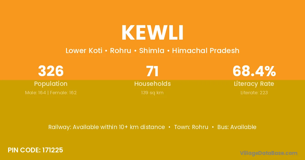 Kewli village has a total population of 326 people, of which 164 are males and 162 are females.