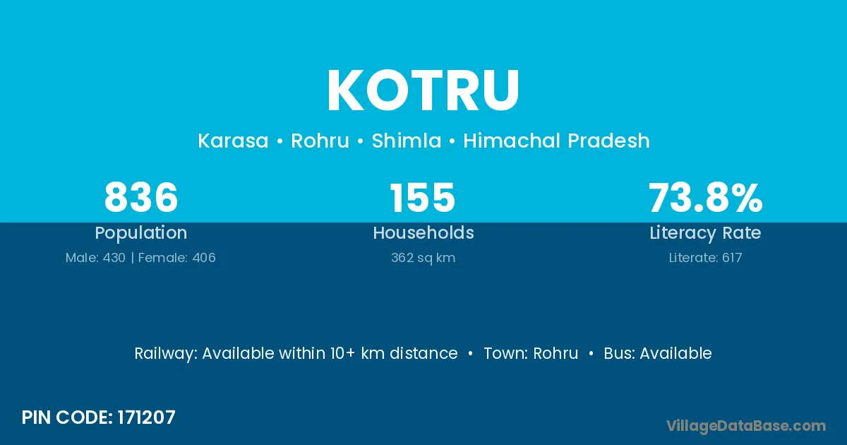 Kotru village has a total population of 836 people, of which 430 are males and 406 are females.
