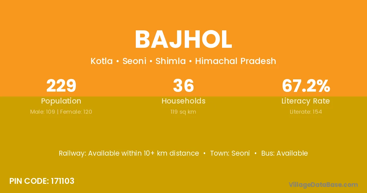 Bajhol village has a total population of 229 people, of which 109 are males and 120 are females.