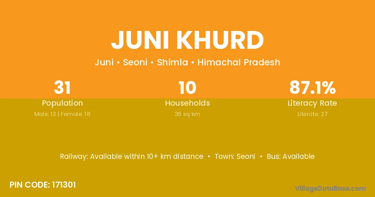 Juni Khurd village has a total population of 31 people, of which 13 are males and 18 are females.
