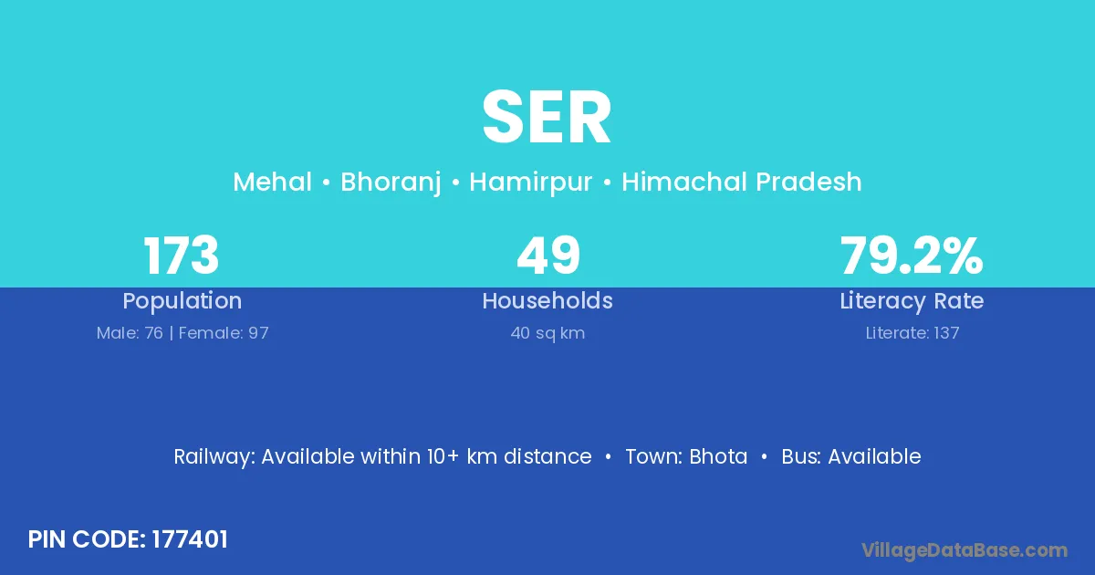 The literacy rate of Ser village is 78.23%. Male literacy stands at 86.49% and female literacy at 69.86%.