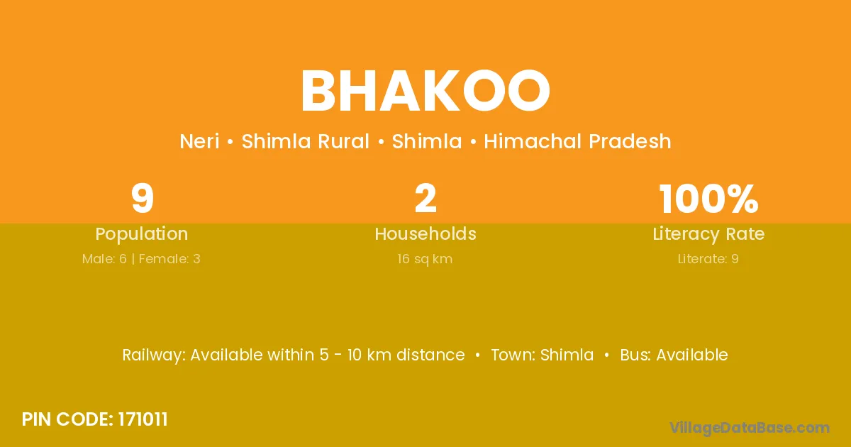 Bhakoo village has a total population of 9 people, of which 6 are males and 3 are females.