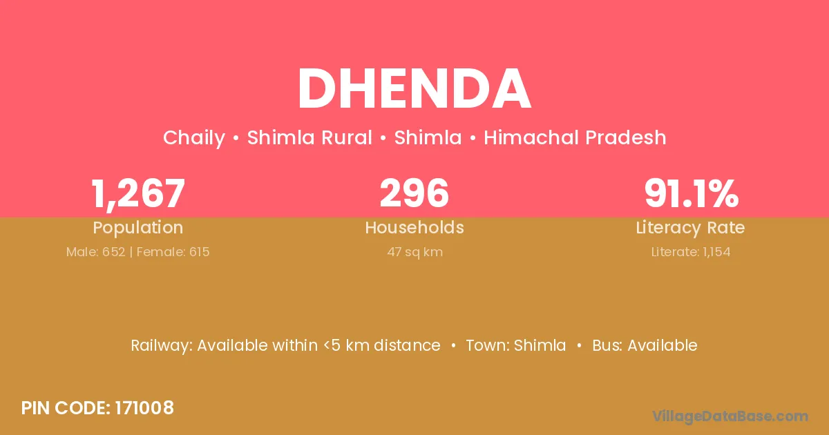 Dhenda village has a total population of 1,267 people, of which 652 are males and 615 are females.