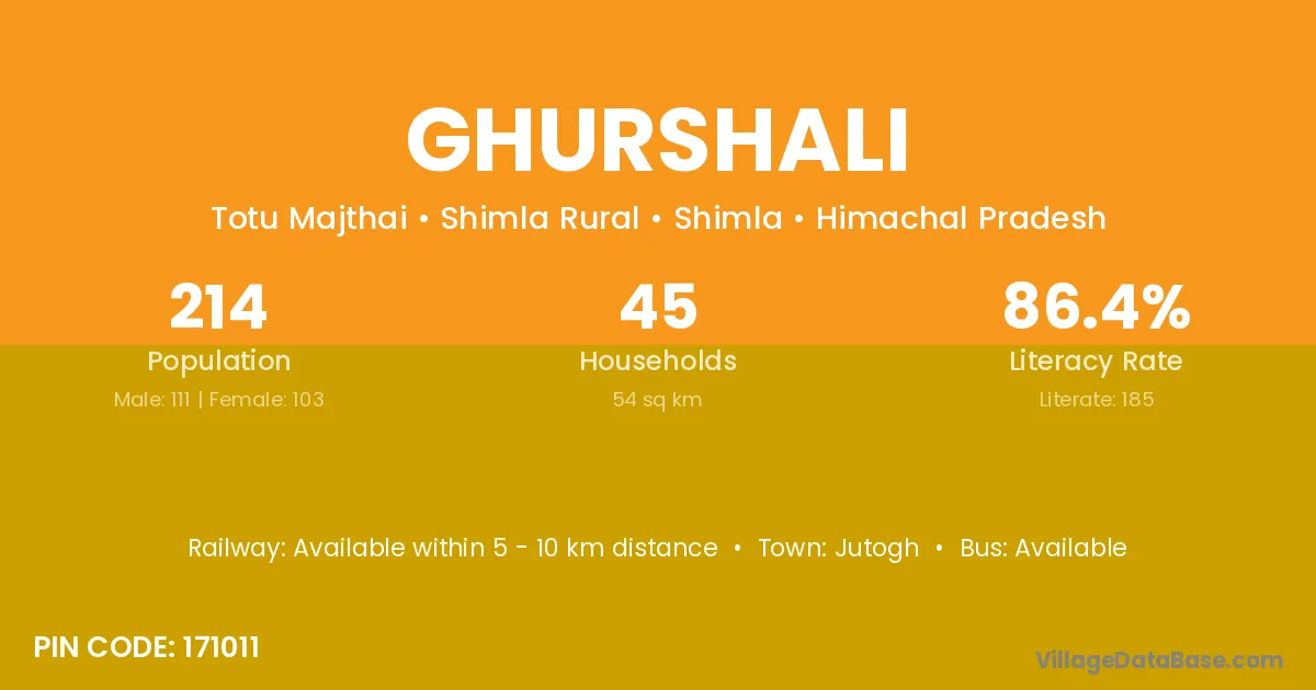 Ghurshali village has a total population of 214 people, of which 111 are males and 103 are females.