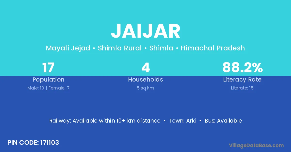 Jaijar village has a total population of 17 people, of which 10 are males and 7 are females.