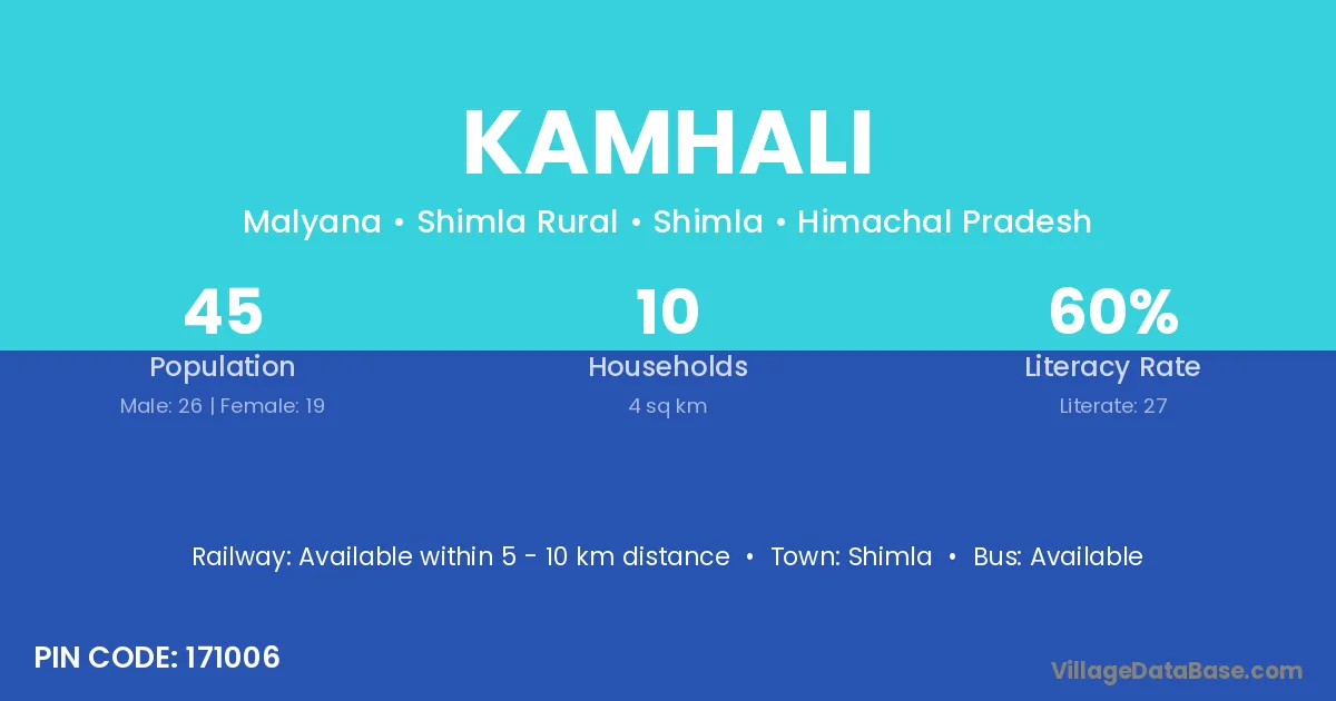 Kamhali village has a total population of 45 people, of which 26 are males and 19 are females.