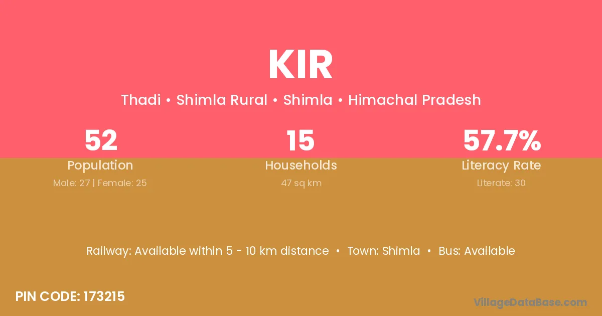 According to Census 2011 information, the village code of Kir village is 173215.