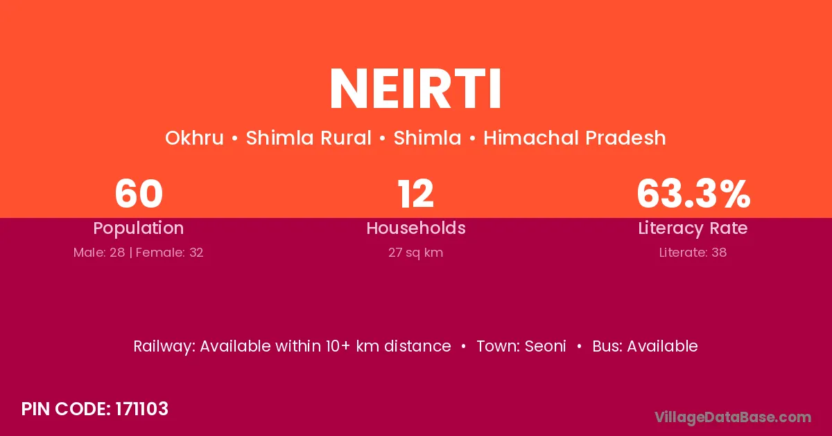 Neirti village has a total population of 60 people, of which 28 are males and 32 are females.