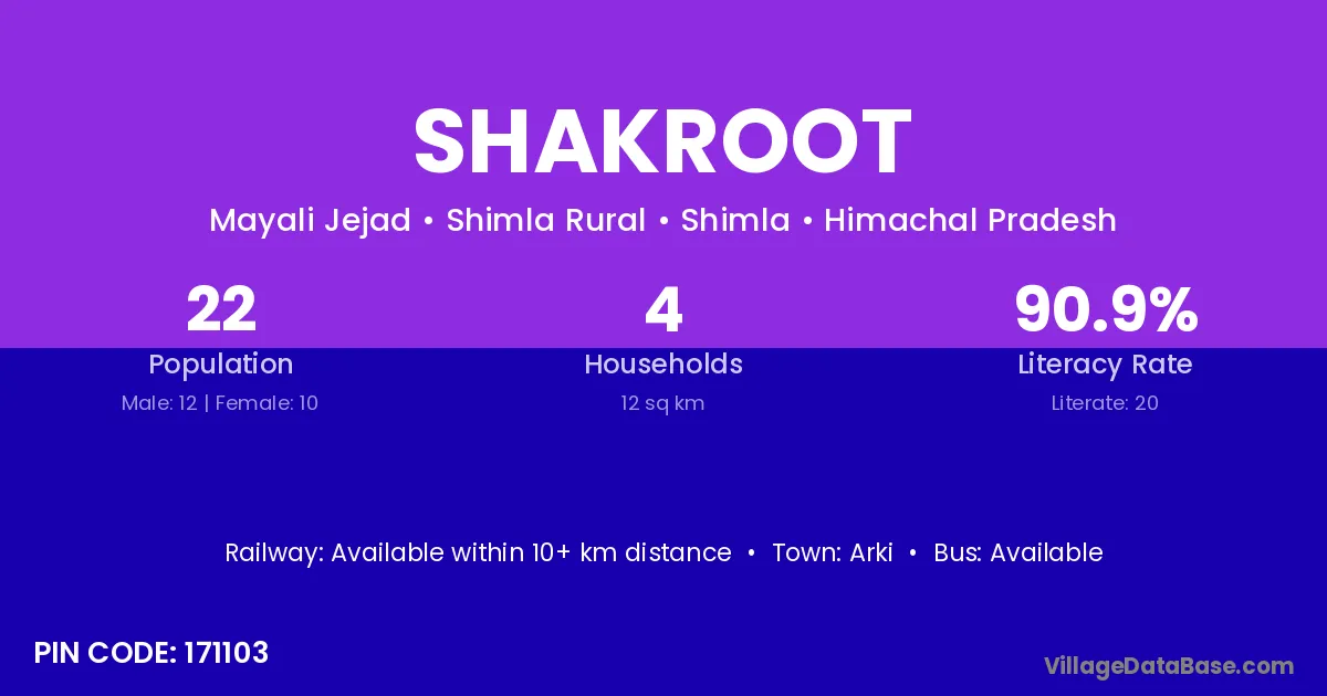 Shakroot village has a total population of 22 people, of which 12 are males and 10 are females.