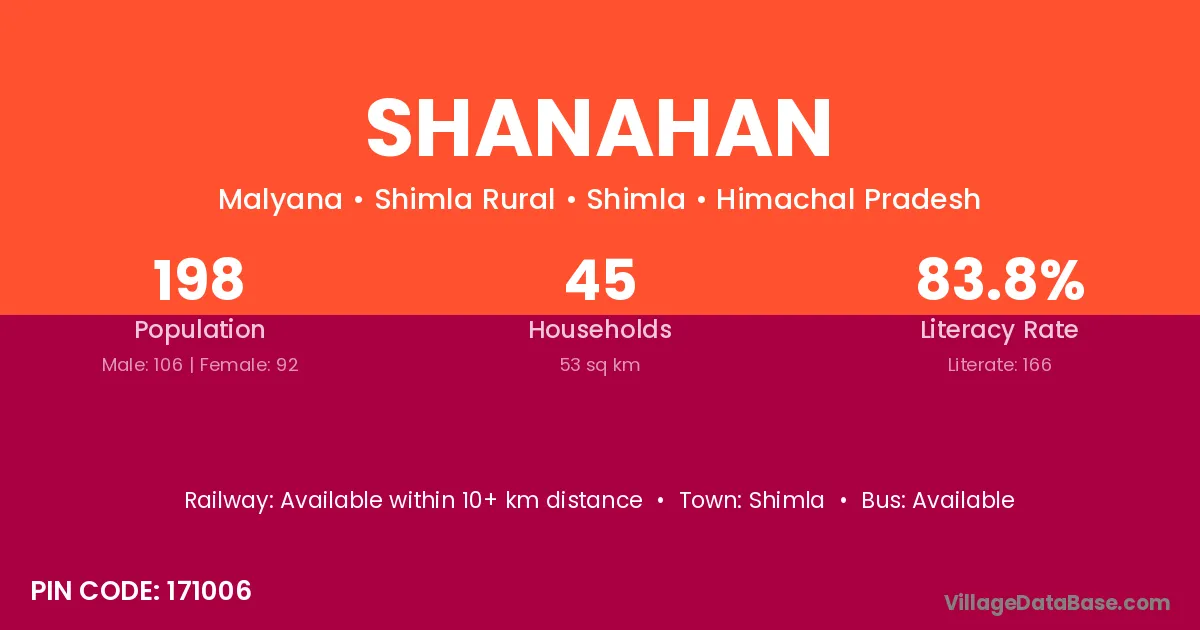 Shanahan village has a total population of 198 people, of which 106 are males and 92 are females.