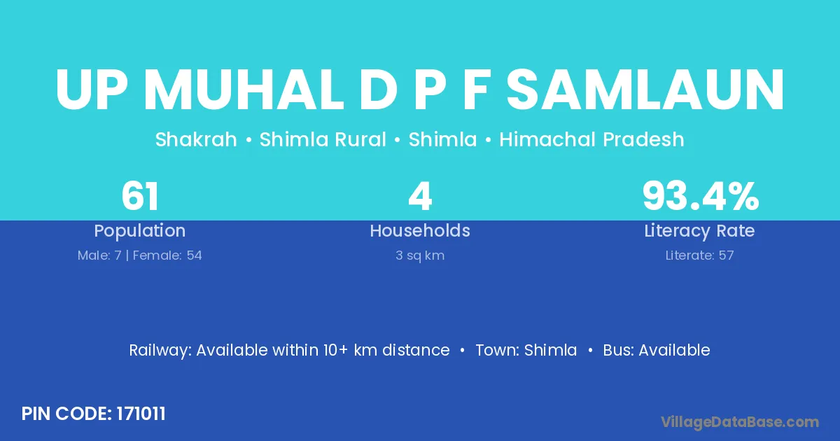 Up Muhal D P F Samlaun village has a total population of 61 people, of which 7 are males and 54 are females.