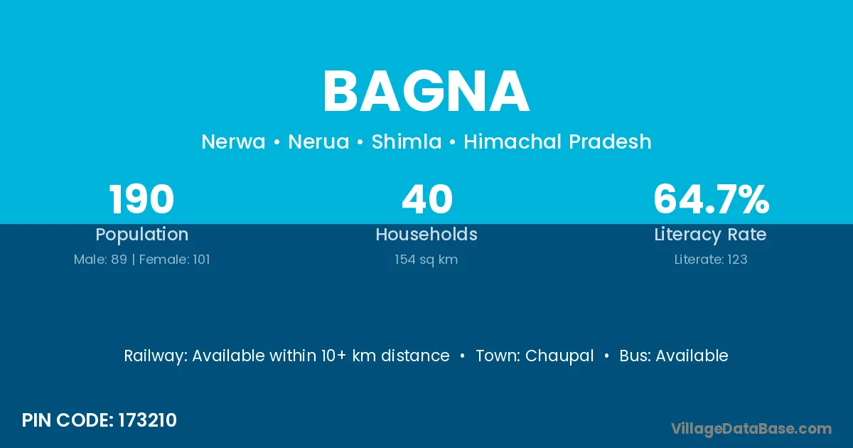 Bagna village has a total population of 193 people, of which 101 are males and 92 are females.