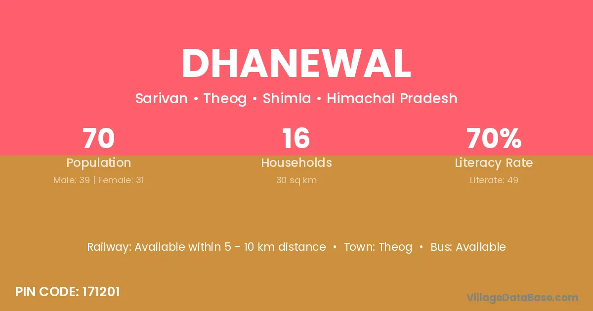 Dhanewal village has a total population of 70 people, of which 39 are males and 31 are females.