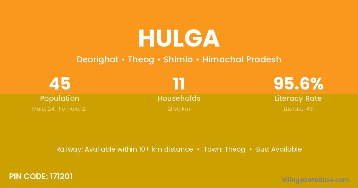 Hulga village has a total population of 45 people, of which 24 are males and 21 are females.