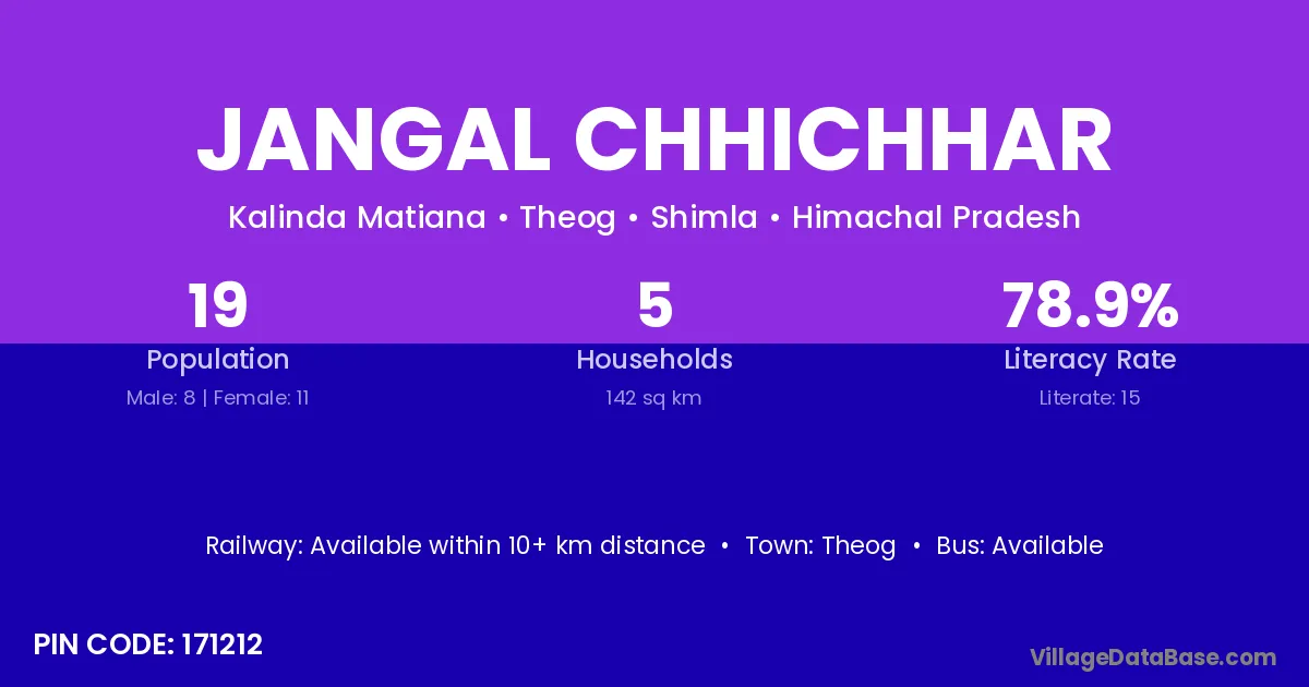 Jangal Chhichhar village has a total population of 19 people, of which 8 are males and 11 are females.