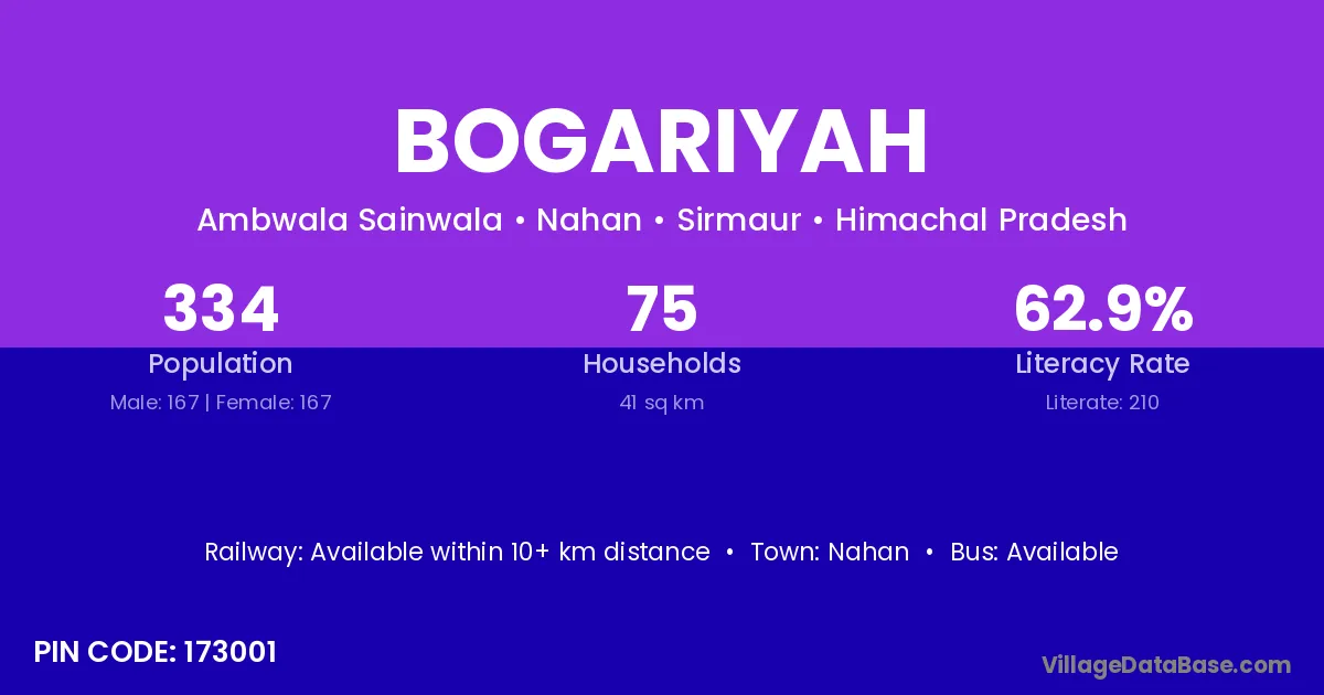 According to Census 2011 information, the village code of Bogariyah village is 173001.