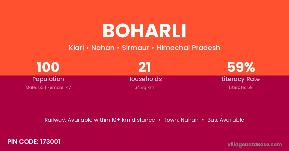 Boharli village has a total population of 100 people, of which 53 are males and 47 are females.