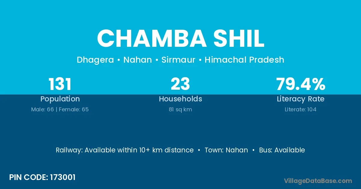 Chamba Shil village has a total population of 131 people, of which 66 are males and 65 are females.