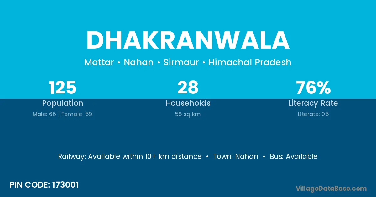 Dhakranwala village has a total population of 125 people, of which 66 are males and 59 are females.