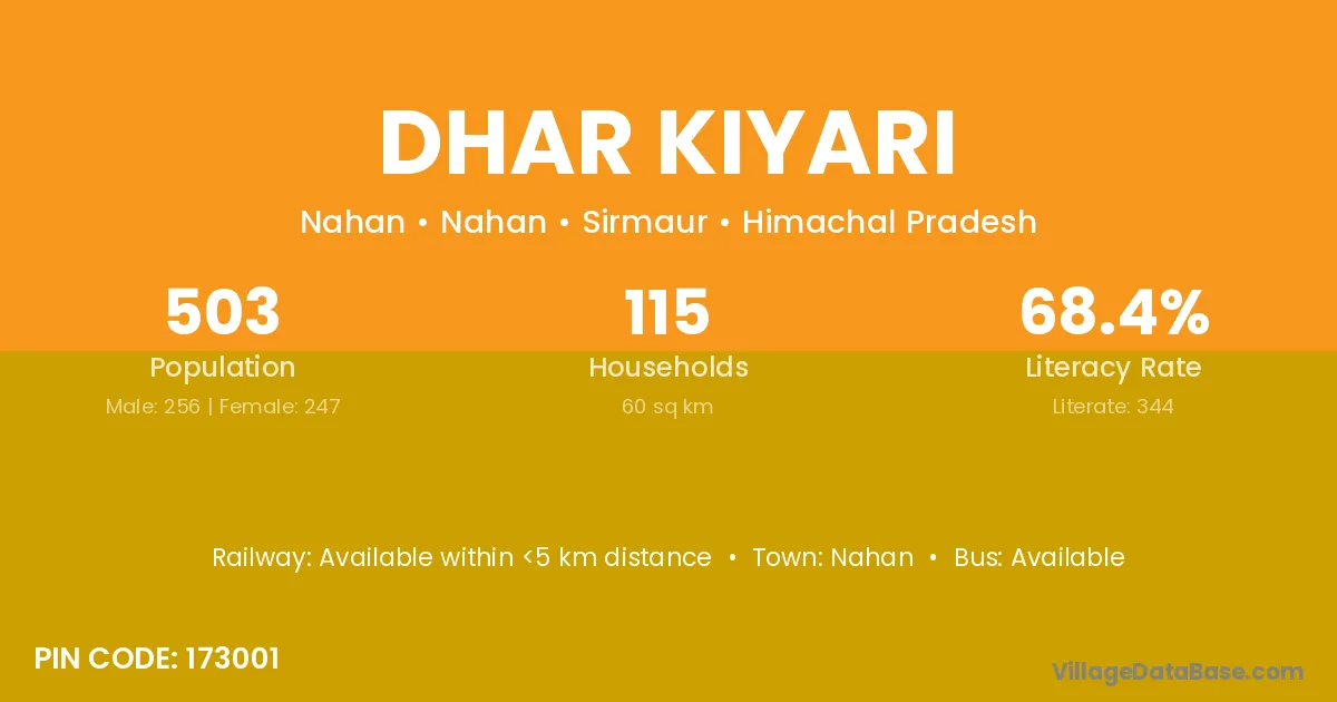 Dhar Kiyari village has a total population of 503 people, of which 256 are males and 247 are females.